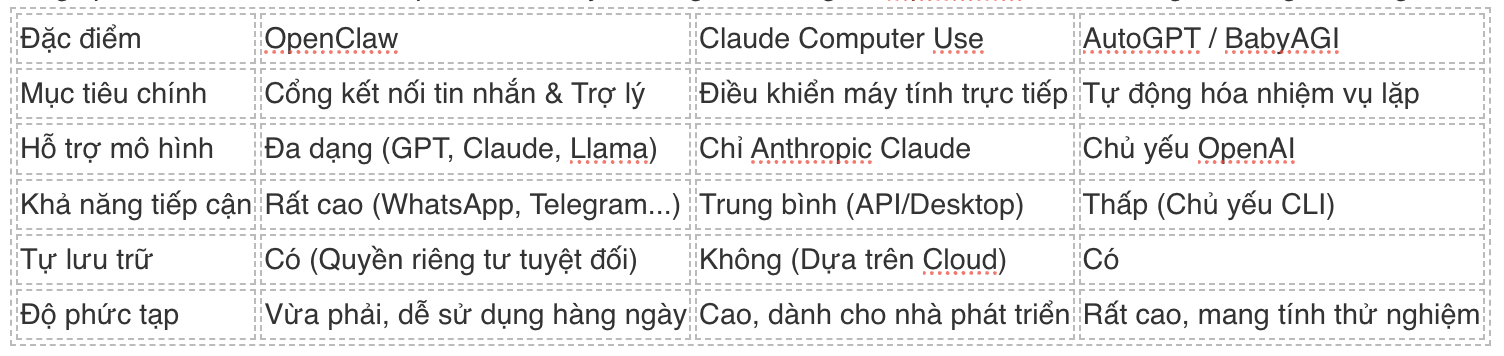 Để giúp bạn có cái nhìn khách quan, dưới đây là bảng so sánh giữa OpenClaw và các công cụ AI Agent hàng đầu hiện nay: