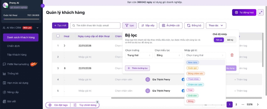 - Tích hợp nhanh chóng, không cần kỹ thuật phức tạp: Preny dễ dàng kết nối với ZBS, tạo tệp dữ liệu có sẵn thông qua Mini CRM . Ban đầu Chatbot lấy số điện thoại và thông tin khách, tiếp đến là dữ liệu được lưu trữ Mini CRM và dùng ZBS để Remarketing đến các khách hàng tiềm năng theo từng nhóm bạn phân loại.